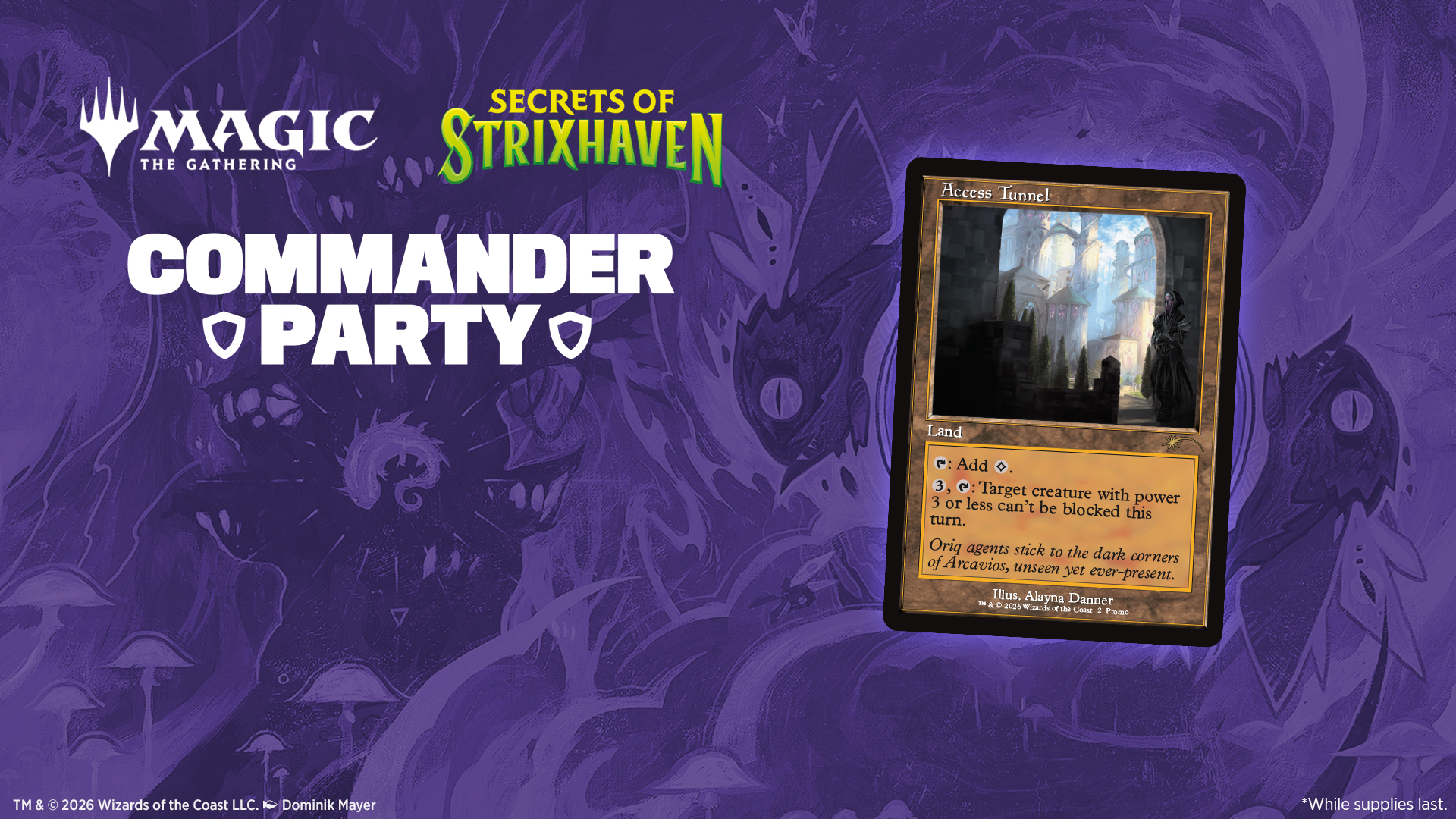 Für Geheimnisse von Strixhaven ist die Commander-Party ein Event mit Akademie-Thema, bei dem sich Spielende einer der fünf Fakultäten anschließen und einzigartige Zaubersprüche vorbereiten, sowie sie in der Partie Errungenschaften erfüllen. Nachdem sie alle drei Zaubersprüche gewirkt haben, schalten sie eine mächtige, für die jeweilige Fakultät spezifische Abschlussarbeit-Fähigkeit frei.